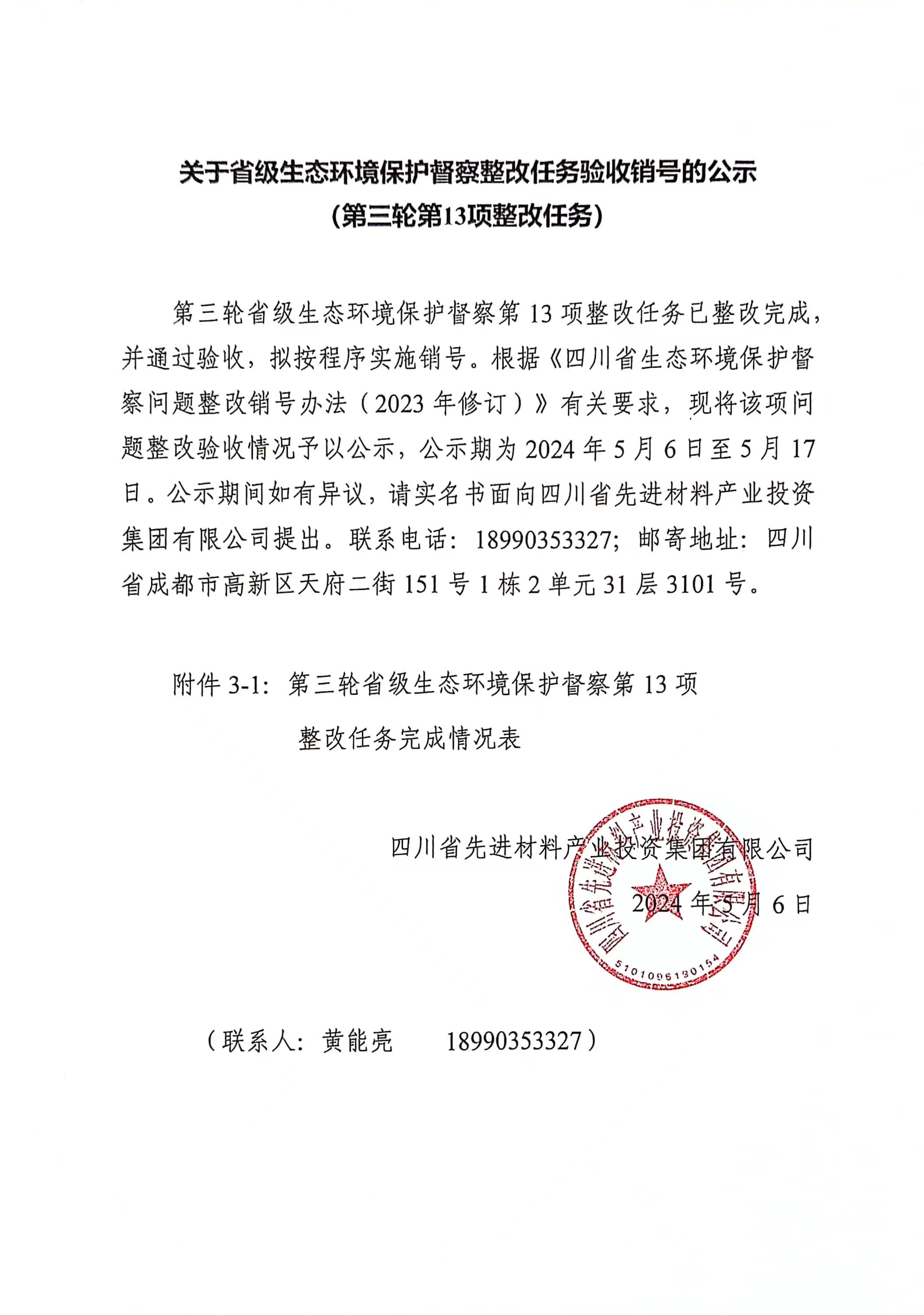 关于省级生态环境保护督察整改任务验收销号的公示(第三轮第13项整改任务)